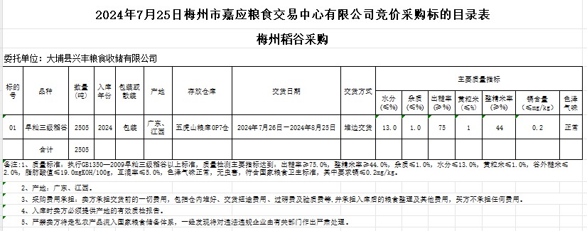 受客戶委托,梅州市嘉應(yīng)糧食交易中心有限公司定于2024年7月25日(星期四)舉辦糧食競價(jià)交易會(huì)。大埔縣興豐糧食收儲(chǔ)有限公司擬采購2024年產(chǎn)早秈稻谷2505噸。