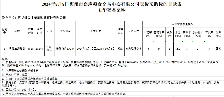 受客戶委托,梅州市嘉應(yīng)糧食交易中心有限公司定于2024年8月8日(星期四)舉辦糧食競價交易會。五華縣琴江糧油收儲管理有限公司擬采購2024年產(chǎn)早秈稻谷3820噸。