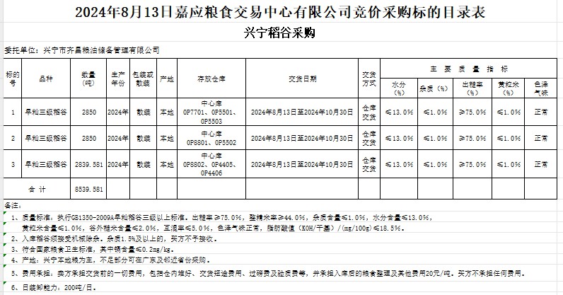 受客戶委托,梅州市嘉應糧食交易中心有限公司定于2024年8月13日(星期二)舉辦糧食競價交易會。興寧市齊昌糧油儲備管理有限公司擬采購2024年產早秈稻8539.581噸。