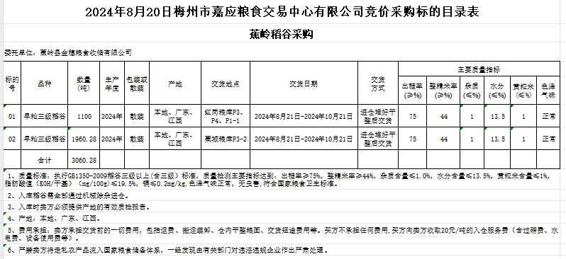 受客戶委托,梅州市嘉應糧食交易中心有限公司定于2024年8月20日(星期二)舉辦糧食競價交易會。蕉嶺縣金穗糧食收儲有限公司擬采購2024年產早秈稻3060.28噸。
