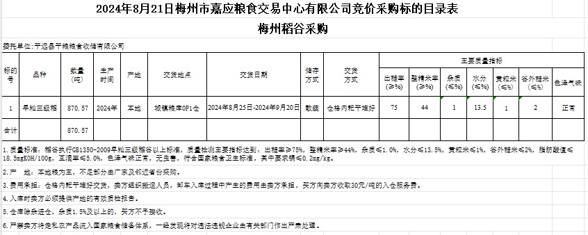 受客戶委托,梅州市嘉應(yīng)糧食交易中心有限公司定于2024年8月21日(星期三)舉辦糧食競價交易會。平遠縣平糧糧食收儲有限公司擬采購2024年產(chǎn)早秈稻870.57噸。