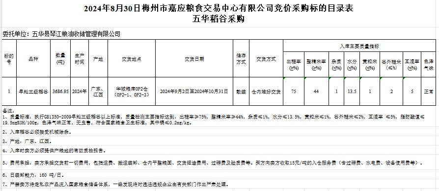 受客戶委托,梅州市嘉應(yīng)糧食交易中心有限公司定于2024年8月30日(星期五)舉辦糧食競價(jià)交易會(huì)。五華縣琴江糧油收儲(chǔ)管理有限公司擬采購2024年產(chǎn)早秈稻谷3686.95噸。