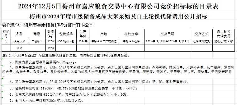 梅州市2024年度市級儲備成品大米采購及自主輪換代儲費用公開招標(biāo)公告