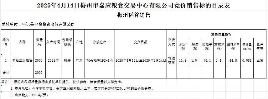 受客戶委托,梅州市嘉應(yīng)糧食交易中心有限公司定于2025年4月14日(星期一)舉辦糧食競價交易會。平遠(yuǎn)縣平糧糧食收儲有限公司擬銷售2022年產(chǎn)早秈稻谷2000噸。