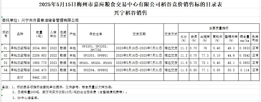 受客戶委托,梅州市嘉應(yīng)糧食交易中心有限公司定于2025年5月15日(星期四)舉辦糧食競價交易會。興寧市齊昌糧油儲備管理有限公司擬銷售2022年、2023年產(chǎn)早秈稻谷9442.183噸。