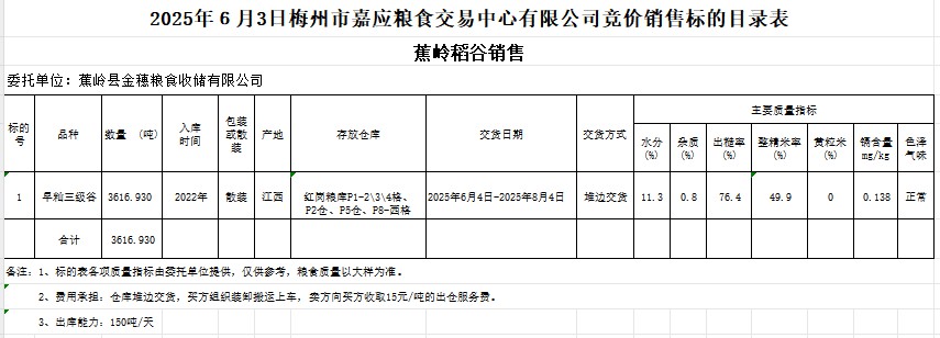 受客戶委托,梅州市嘉應(yīng)糧食交易中心有限公司定于2025年6月3日(星期二)舉辦糧食競價交易會。蕉嶺縣金穗糧食收儲有限公司擬銷售2022年產(chǎn)早秈稻谷3616.930噸。