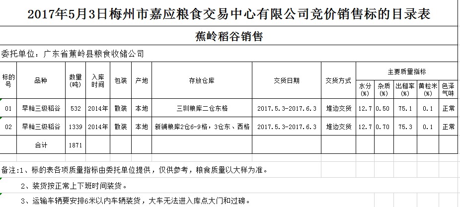 受客戶委托,梅州市嘉應(yīng)糧食交易中心有限公司定于2017年5月3日舉辦糧食競(jìng)價(jià)交易會(huì),廣東省蕉嶺縣糧食收儲(chǔ)公司擬銷售2014年早秈三級(jí)稻谷1871噸。