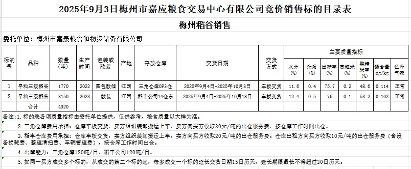 受客戶(hù)委托,梅州市嘉應(yīng)糧食交易中心有限公司定于2025年9月3日(星期三)舉辦糧食競(jìng)價(jià)交易會(huì)。梅州市嘉泰糧食和物資儲(chǔ)備有限公司擬銷(xiāo)售2022年、2023年產(chǎn)早秈稻谷4920噸。