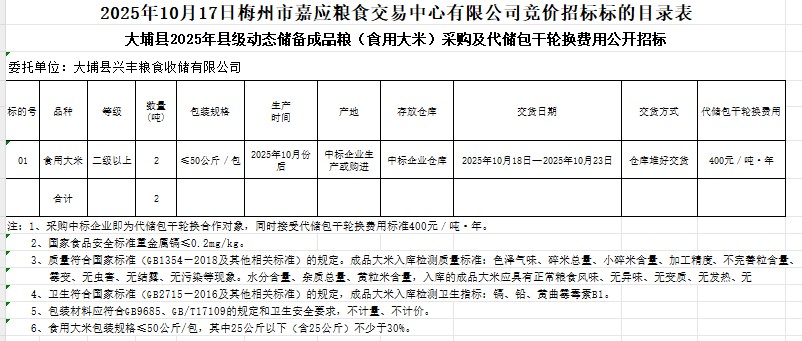大埔縣2025年縣級(jí)動(dòng)態(tài)儲(chǔ)備成品糧(食用大米)采購及代儲(chǔ)包干輪換費(fèi)用公開招標(biāo)公告