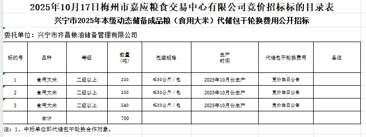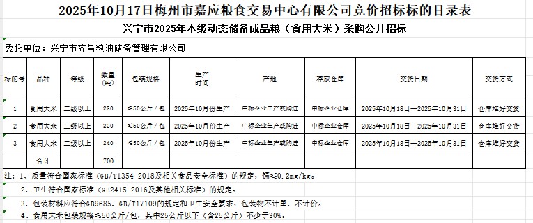 興寧市2025年本級動(dòng)態(tài)儲備成品糧(食用大米)采購及代儲包干輪換費(fèi)用公開招標(biāo)公告
