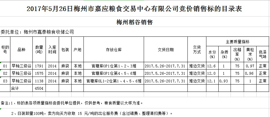 受客戶委托,梅州市嘉應(yīng)糧食交易中心有限公司定于2017年5月26日舉辦糧食競(jìng)價(jià)交易會(huì),梅州市嘉泰糧食收儲(chǔ)公司擬銷售早秈三級(jí)稻谷4504噸。