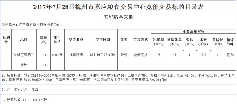 2017年7月28日廣東省五華縣糧食收儲公司稻谷采購