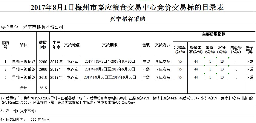 受客戶委托,梅州市嘉應(yīng)糧食交易中心有限公司定于2017年8月1日舉辦糧食競價交易會,興寧市糧食收儲公司擬采購2017年早秈三級稻谷共8215噸。