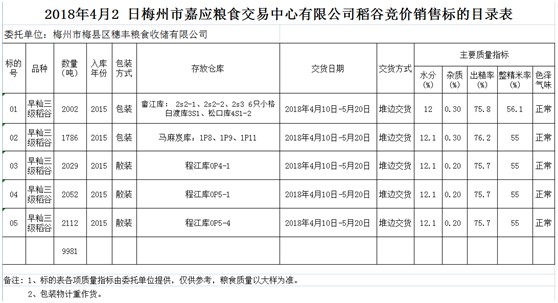 受客戶委托,梅州市嘉應糧食交易中心有限公司定于2018年4月9日(星期一)舉辦糧食競價交易會,梅州市梅縣區(qū)穗豐糧食收儲有限公司擬銷售早秈稻9981噸。