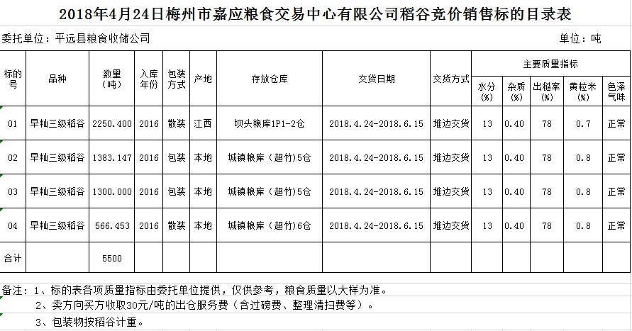 交易時(shí)間和地點(diǎn):2018年4月24日(星期二)上午10時(shí)。廣東省梅州市彬芳大道南161號(hào)梅州市糧食交易中心3樓。