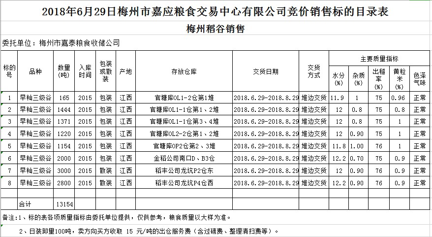 受客戶委托,梅州市嘉應(yīng)糧食交易中心有限公司定于2018年6月29日(星期五)舉辦糧食競(jìng)價(jià)交易會(huì),梅州市嘉泰糧食收儲(chǔ)公司擬銷(xiāo)售早秈稻13154噸。